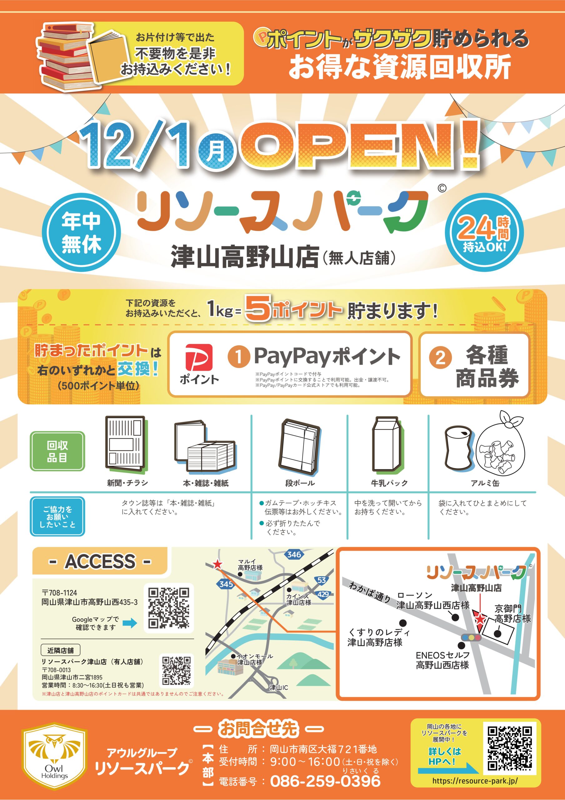 この度、より多くの皆様に便利にご利用いただけるよう、下記日程にて新店舗「リソースパーク津山高野山店」をオープンする運びとなりました。